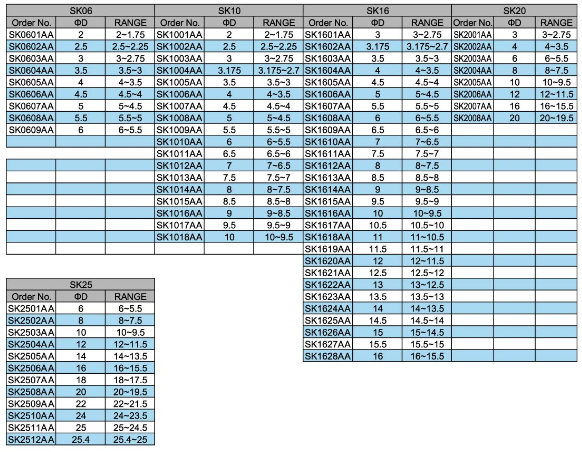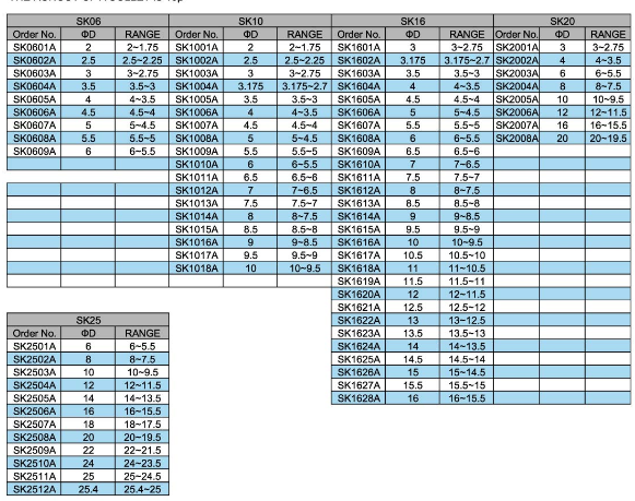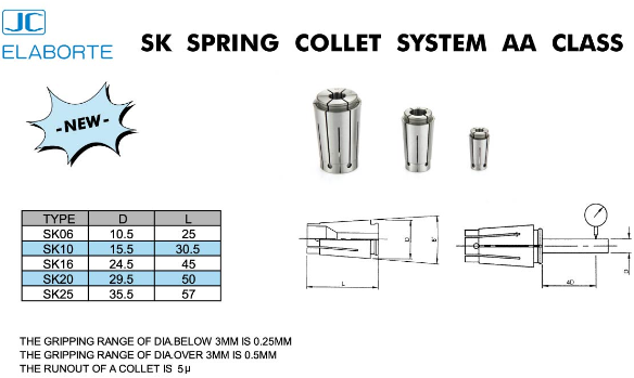 產品描述:SK筒夾系列: A級: 1.HRC : 47° 2.CLAMPING RANGE : D1 below 3mm is 0.25mm. D1 over 3mm is 0.5mm.(A class only) AA級: 1.HRC : 47° 2.CLAMPING RANGE : D1 below 3mm is 0.25mm. D1 over 3mm is 0.5mm.(A class