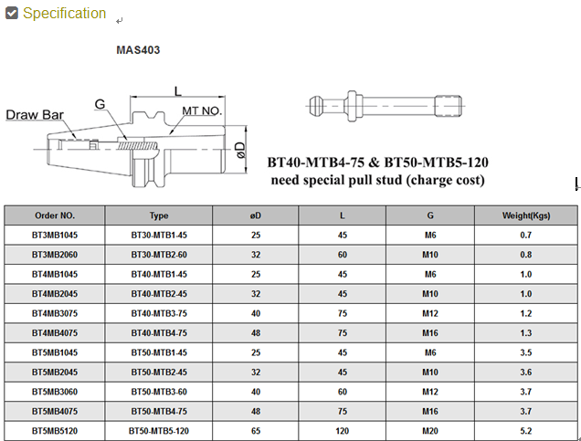 • 產品描述:BT/MTB 莫氏無扁尾刀柄/刀桿:BT30→M12 x 1.75P,BT40→M16 x 2.0P,BT50→M24 x 3.0P