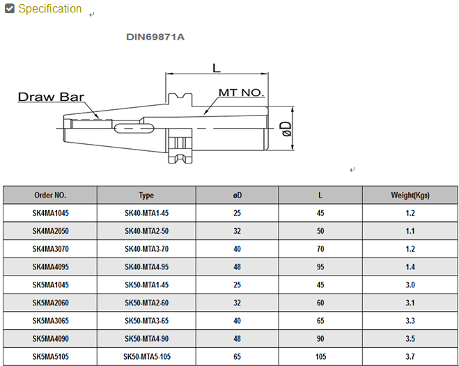 • 產品描述:SK莫氏帶扁尾刀柄SK/MTA :Draw Bar:SK40→M16 x 2.0P,SK50→M24 x 3.0P